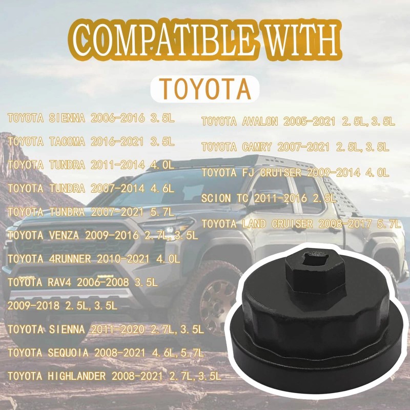 - Compatible With - Our oil filter wrench is compatible with Toy0ta, RAV4, Lexus, Highlander, Sienna and other vehicles equipped with 2.5L - 5.7L engines that use Toy0ta's cartridge style oil filter system