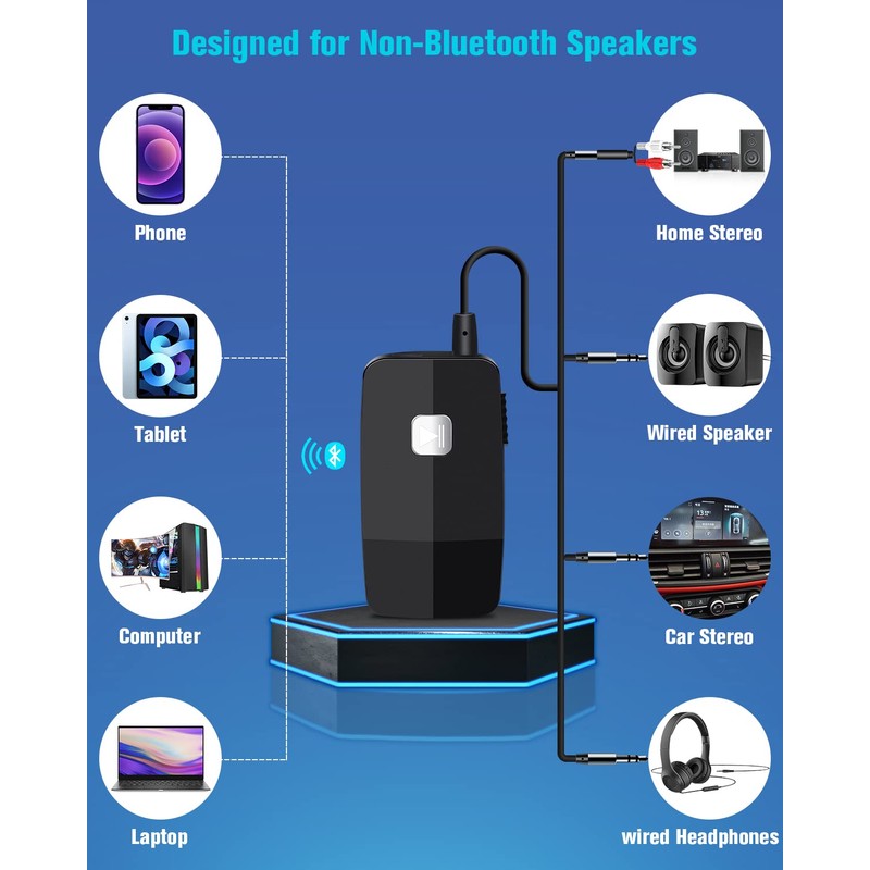 - 【Easy to Use】Pairs with your Bluetooth devices like smartphone/tablet/laptop and connect it to your car stereo/old speaker/home stereo system/wired speaker/headphones by the 3.5mm/RCA audio cable (included). NOTE: There isn't a built-in microphone, CANNOT support hands-free calling