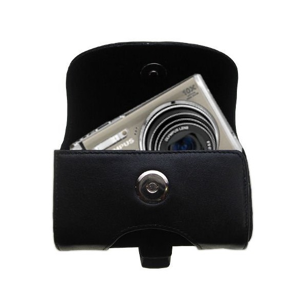 Gomadic Designer Black Leather Olympus Stylus-9010 Digital Camera Belt Carrying Case – Includes Optional Belt Loop and Removable Clip