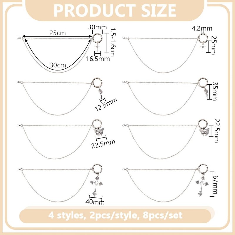 - Pack of 8 shoe chain pendants: you will receive 8 pieces 25 cm (9.84 inches) long shoe chains in 4 different styles, 2 pieces of each style, reusable, the length of the chain is suitable for most shoes, there is enough to meet the needs of your daily life shoes personalised matching and replacement, make your shoes more eye-catching and outstanding