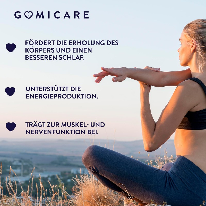 - GOMICARE MAGNESIUM COMPLEX – Gummibärchen mit Magnesiumcitrat, Kalium und Vitamin B6. Entwickelt zur Unterstützung der Muskelerholung, des mentalen Gleichgewichts und eines erholsamen Schlafs. Ideal für Kinder und Erwachsene. Täglich 2 Gummibärchen einnehmen – ganz ohne Wasser. Jede Dose enthält 60 Gummibärchen für eine Monatspackung (2 Gummies pro Tag).