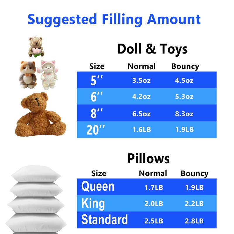 - 【Hypoallergenic-No Fluorescence, No Bleaching, and No Odor】 Our polyester stuffing’s raw materials are clean and free of impurities, and are highly combed for superior quality.