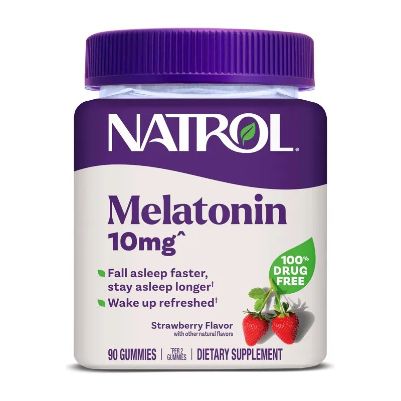 Gomitas de melatonina Natrol, Apoyo al sueño para adultos, Suplemento de melatonina de 10 mg para dormir, 90 gomitas con sabor a fresa, suministro de hasta 45 días