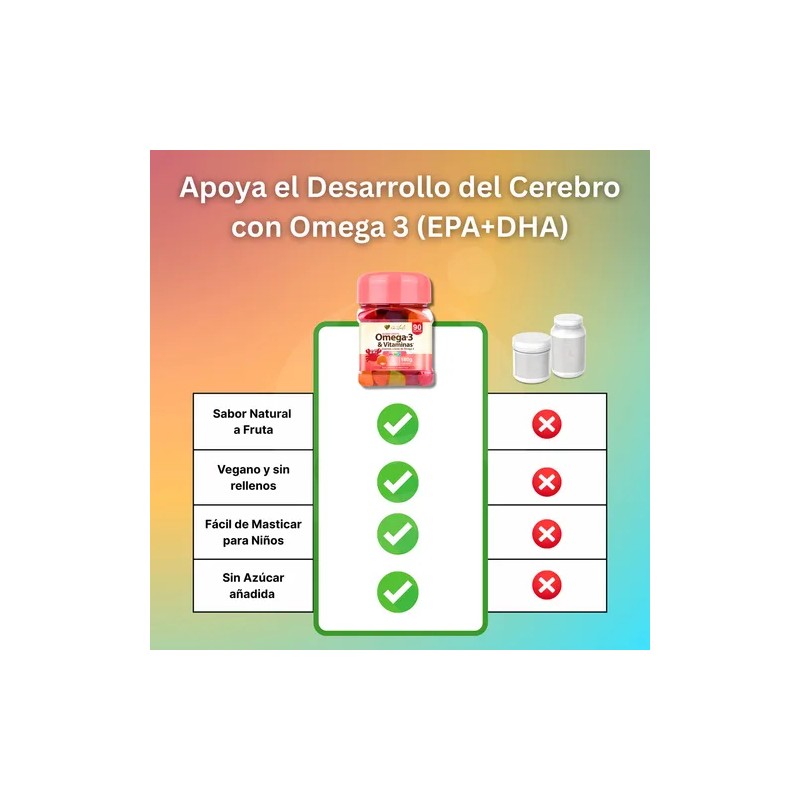 Con 90 unidades por envase, cada gomita proporciona una dosis equilibrada de Omega 3, Vitamina E y Vitamina D, contribuyendo al bienestar general de los niños.
