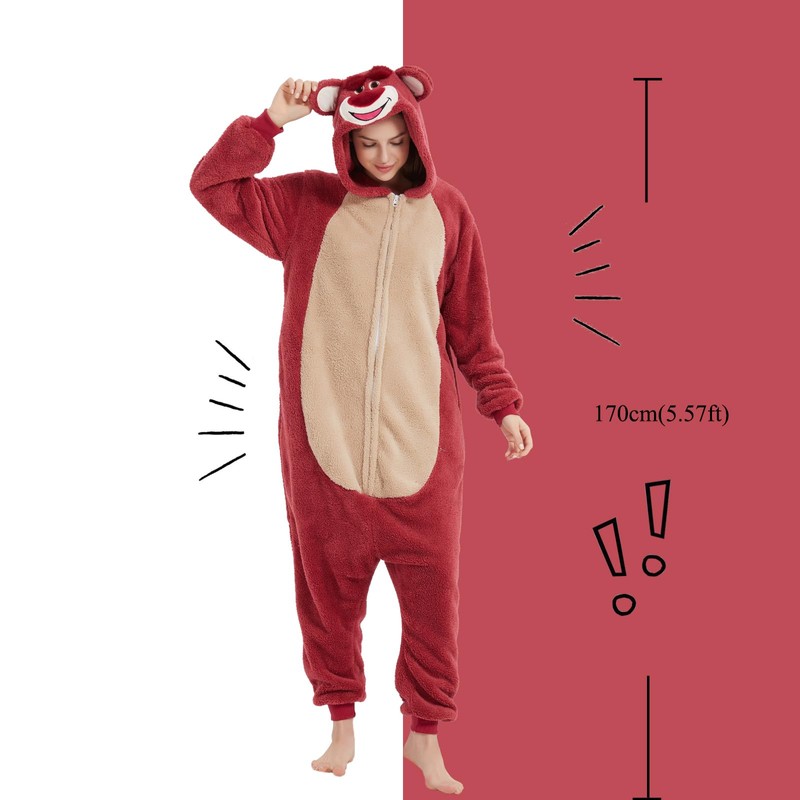 - Design: Unleash your inner child with our fun and cozy animal onesie costume! The loose fit design with zipper closure allows for great relaxation and comfort. The two pockets are perfect for holding small items or keeping your hands warm.
