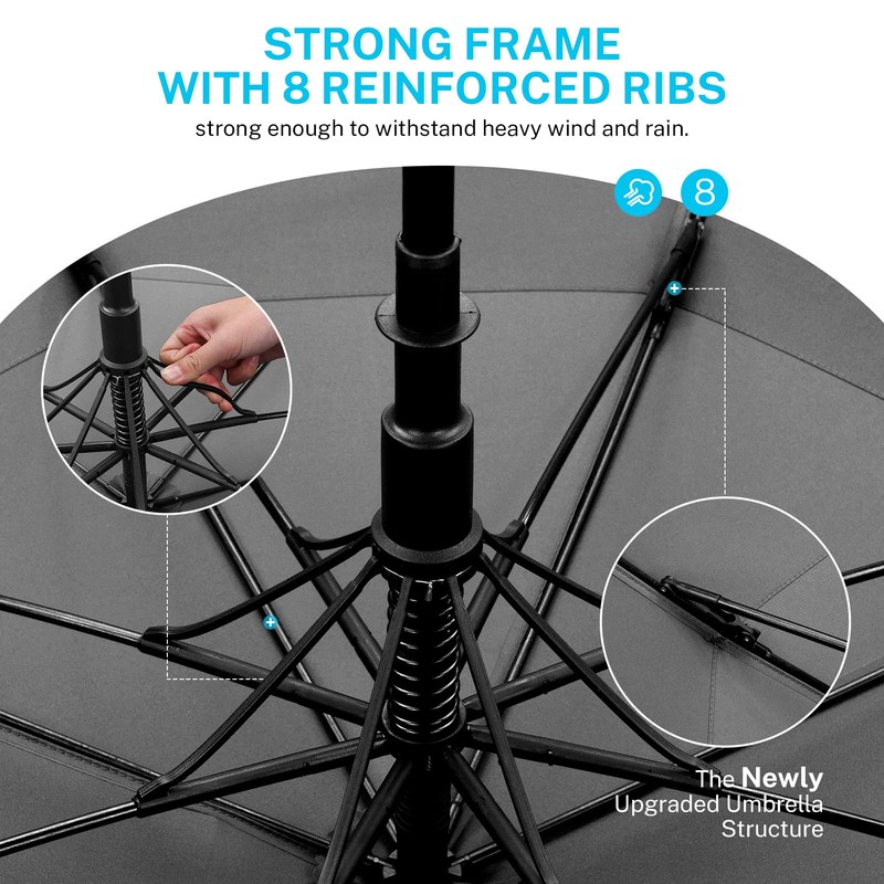 - High-quality material: Made of water-resistant 210T Pongee fabric, cooperated with tough fiberglass shaft and 8 reinforced ribs, it protects you from strong rain, sun, sleet, etc. Another upgraded umbrella with added silver sol layer has strong UPF 50+ UV protection for sunny day