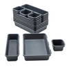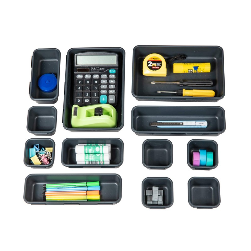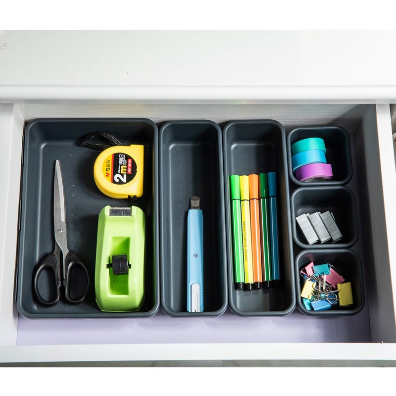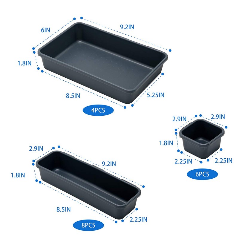 Various Size: The set of 18 office drawer organizers includes 4 - Large ( 9.2 x 6.1 x 1.8 inches ), 8 – Medium ( 9.2 x 2.9 x 1.8 inches), 6 – Small ( 2.7 x 2.7 x 1.8 inches)