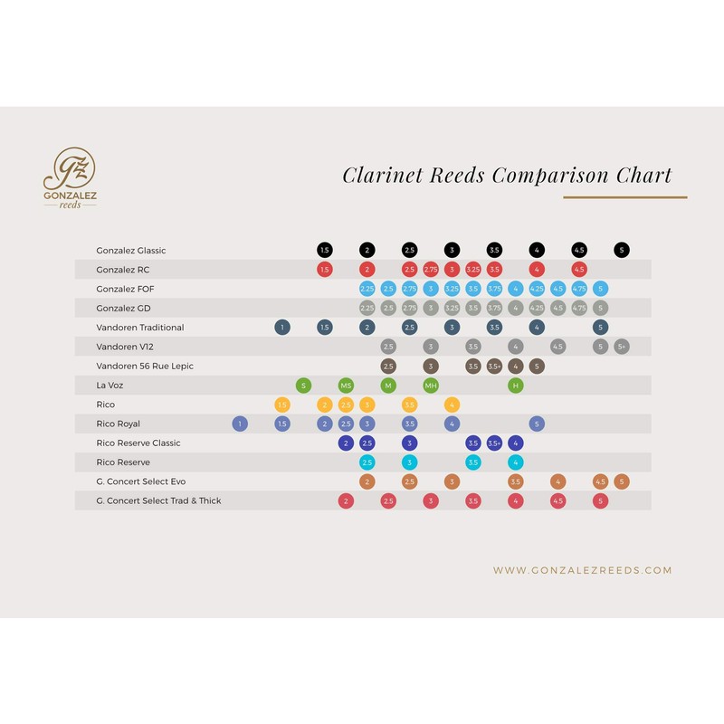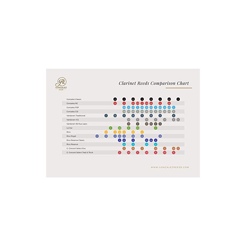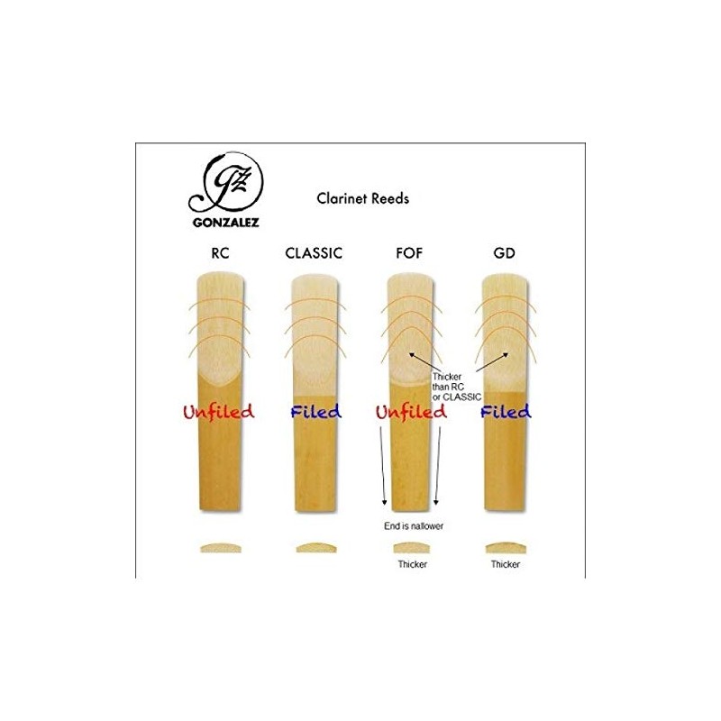 Gonzalez Regular Cut (RC) clarinet reeds are made from cane aged for at least 3 years. This aging process and the French style, half moon cut results in a reed that plays easily in tune and with exceptional response and flexibility in timbre.
