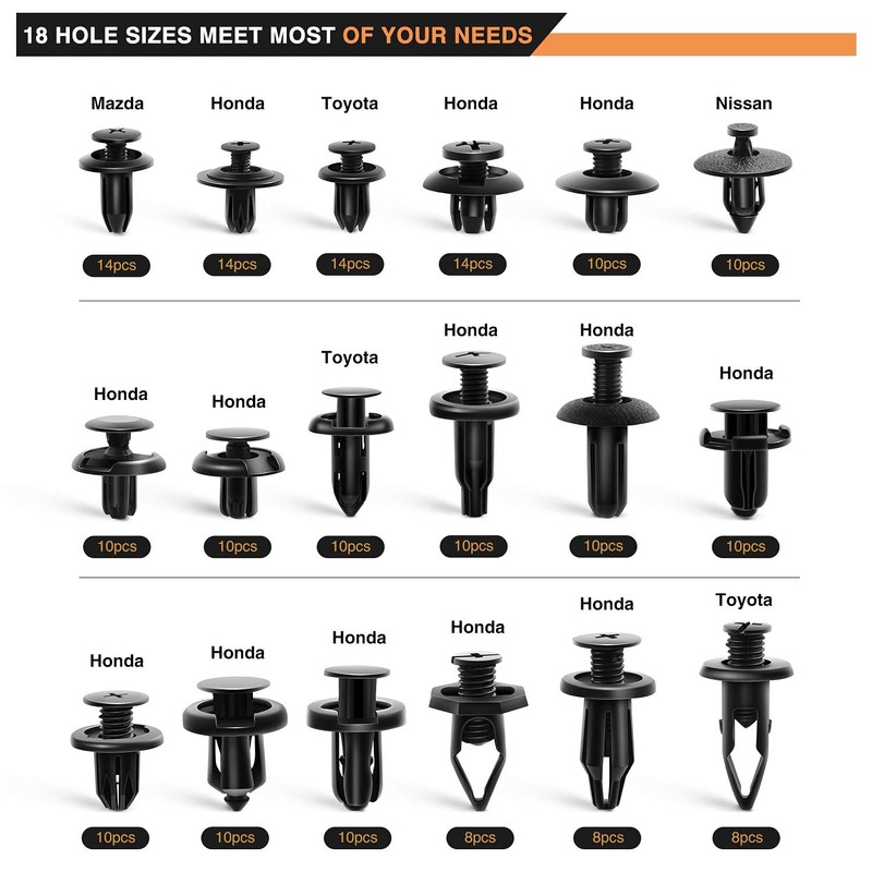 - 【18 MOST COMMON SIZES】- Our auto Puch Type Retainer 190PCS Kit are available in 18 different sizes.Perfect replacement for broken retainers.Can meet the various needs of your car!