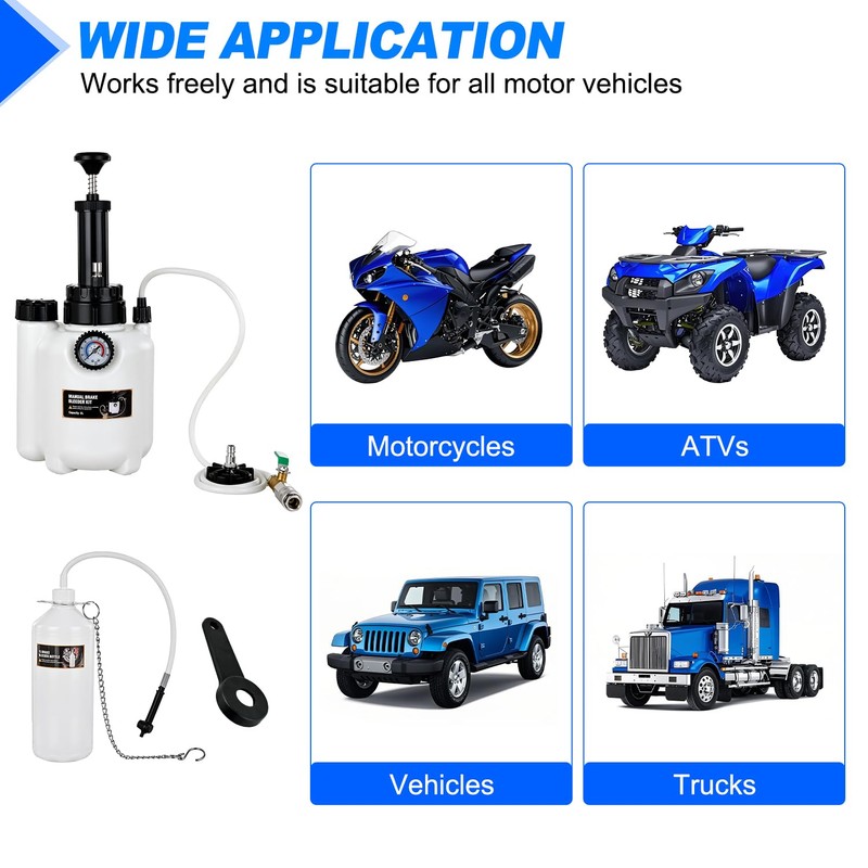 - PACKAGE INCLUDES: 3L Manual Brake Bleeder Fluid Pump x1, 1L Fluid Extractor Bottle x1, 45mm E20 master cylinder adapter x1, 40" Bleeding Hose x1, 12" Hose x1, Hanging Chain & Hook x1, Bottle cap wrench x1. The brake bleeder kit for most brake master cylinder reservoirs, single person can easily perform the operation
