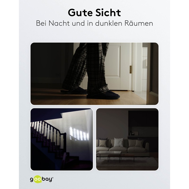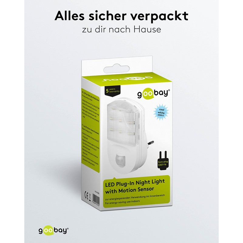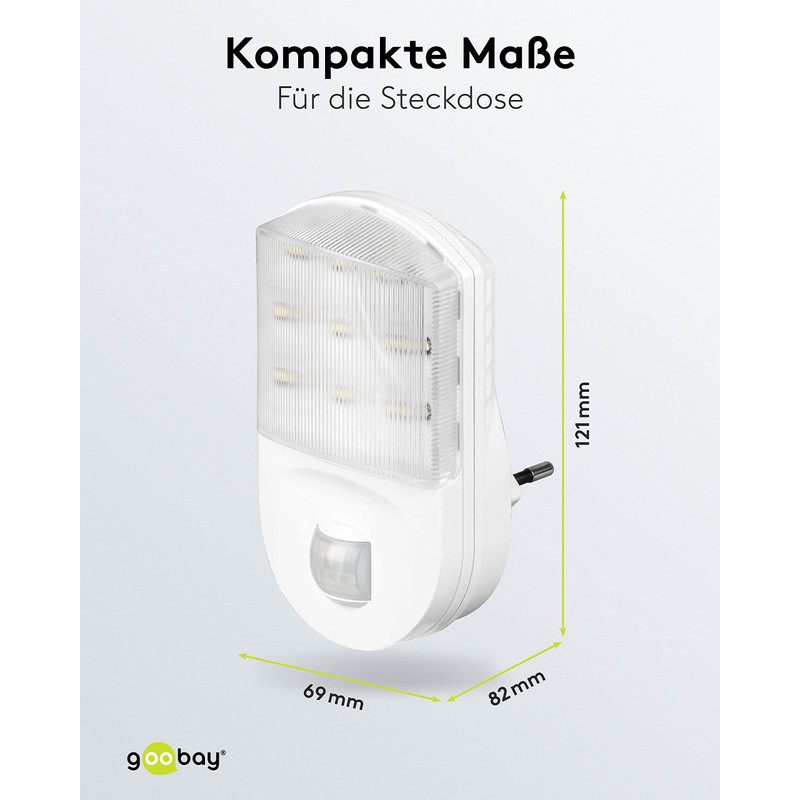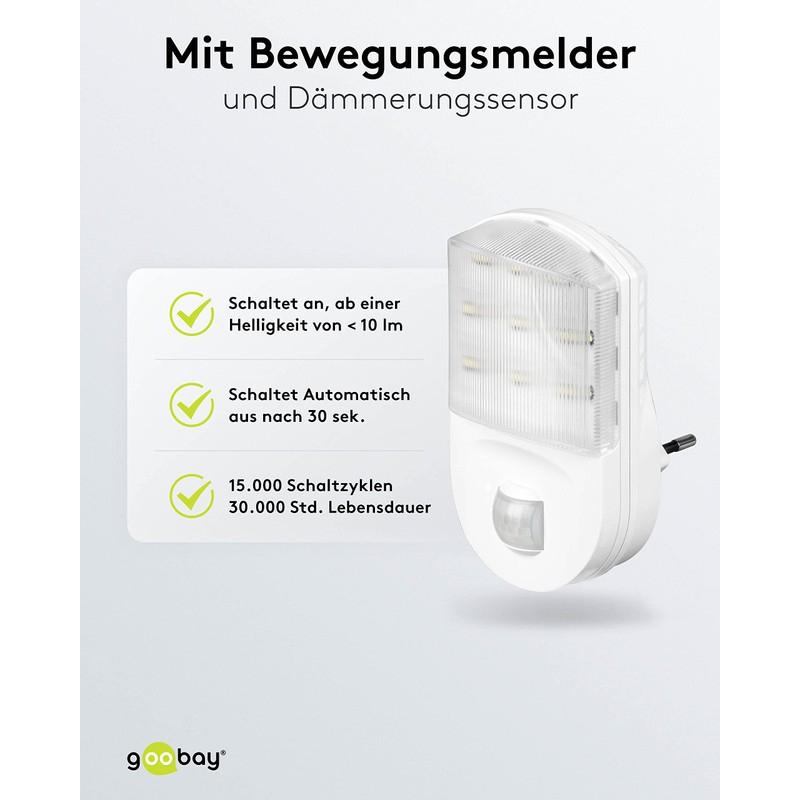 - As soon as there is no movement in the room/detection area, the night lighting automatically switches off again. goobay night light plug with 9 energy-saving LEDs with 6500K & cool white light