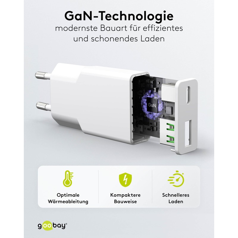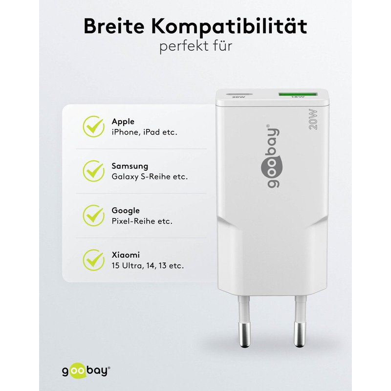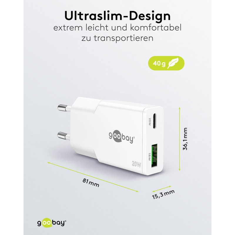 goobay USB-C PD GaN Dual Fast Charger Slim 20 W (White) Power Supply, USB A Port Quick Charge, Power Supply for Smartphone and Tablet - 75730