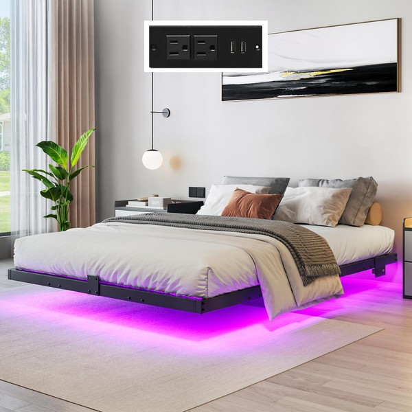 GOOBED Floating Bed Frame Full Size, Bed Frame with Charging Station and LED Lights, Queen Metal Platform Bed with Sturdy Steel Slats, No Box Spring Needed, Simple Assembly, Black