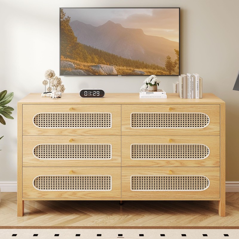 GOOBED Natural Rattan 6 Drawer Dressers Wooden Chest of Drawers with Golden Handles - Modern Large Boho Dressers Storage Cabinet for Living Room Hallway/Entryway Oak