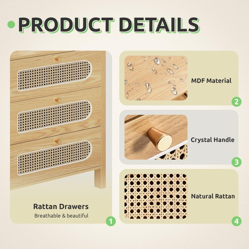 - Double Back Buckle Device Eliminates The Risk of Tipping - Do You Know? If the rattan dresser closet is overturned due to climbing or collision, it can cause harm to families and pets. Therefore, our drawer cabinet adopts dual anti-tipping back buckles, which can better prevent accidents and be responsible for family members.