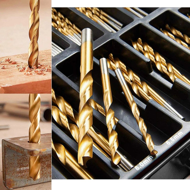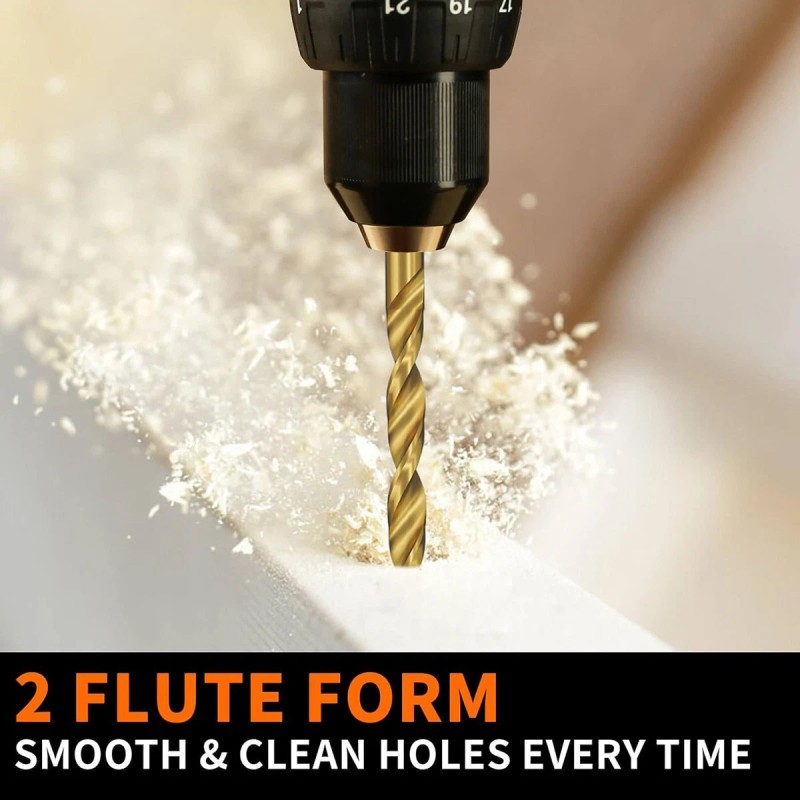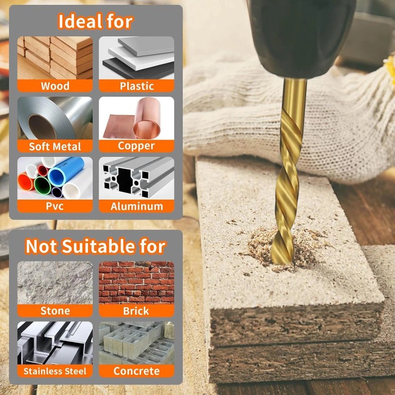 【Titanium Coated Drill Bits for Maximum Durability】 These high-speed steel (HSS) drill bits feature a titanium nitride coating, making them ideal for drilling through metal, wood, plastic, and aluminum alloy. The coating reduces friction, resists heat, and extends the life of the bits, perfect for both DIY projects and professional use.