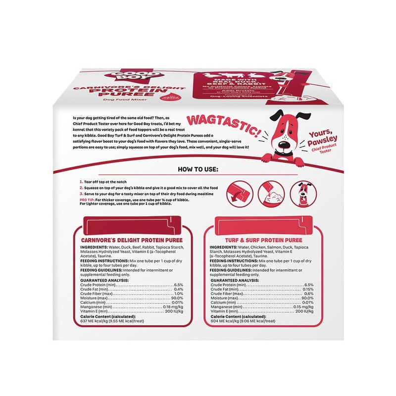 - TOPPER TREATS FROM UK’S #1 DOG TREAT BRAND*: From across the pond, Good Boy Protein Purees are here to boost the protein in your pet's daily diet and enhance the taste of kibble.