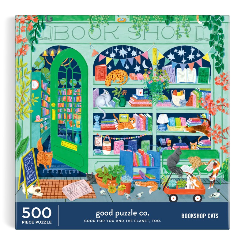 - 500 PIECE PUZZLE – Indulge in the adorable charm of Good Puzzle Co's delightful 500-piece puzzle featuring a colorful bookshop front adorned with curious cats all round. Each piece invites you into a world of playful innocence and cozy comfort, where playful kitties explore their curiosity and the beauty of the books around them. As you unravel the puzzle's intricacies, feel the sense of accomplishment with each fitting piece, and witness the scene come to life before your eyes