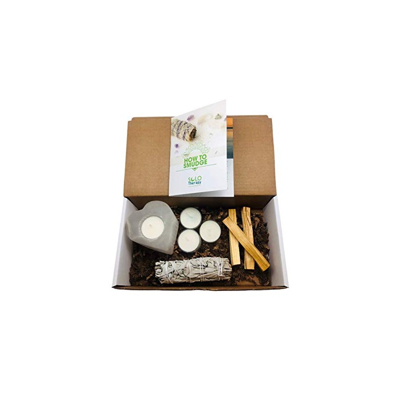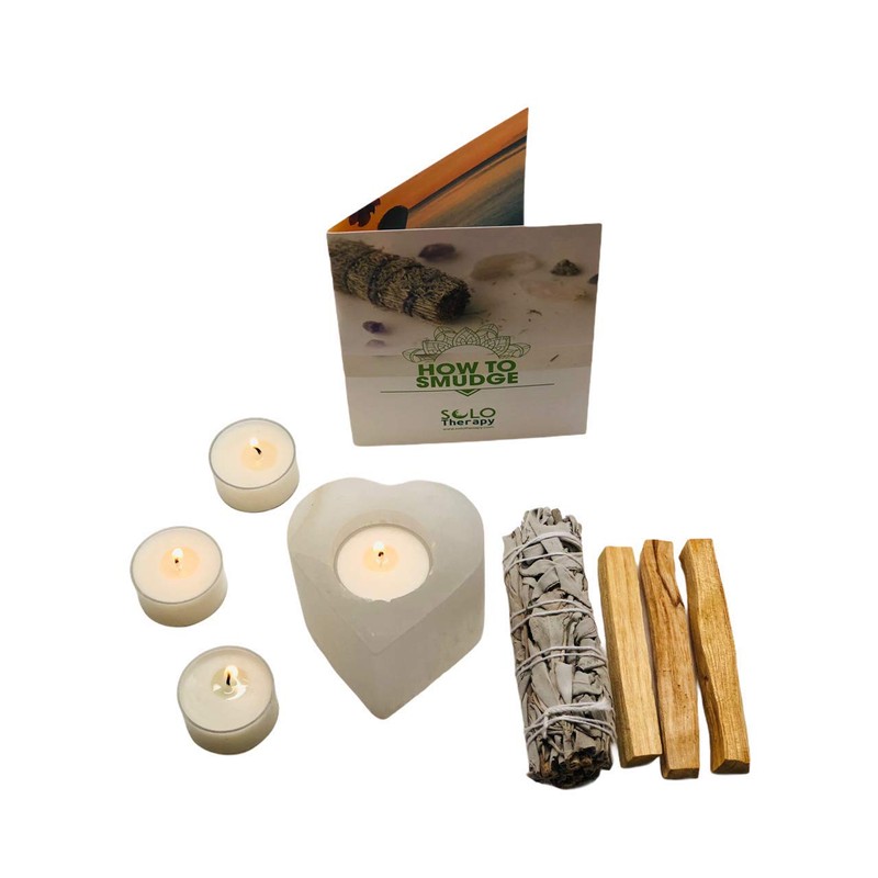'Good Vibes Smudge Kit: 1 Selenite Heart Candle Holder 2" Tall and 3" Wide, 4 White Sage Tealight Candle, 1 White Sage Smudge Stick 4", 3 Palo Santo Sticks 4", How to Smudge Guide Included