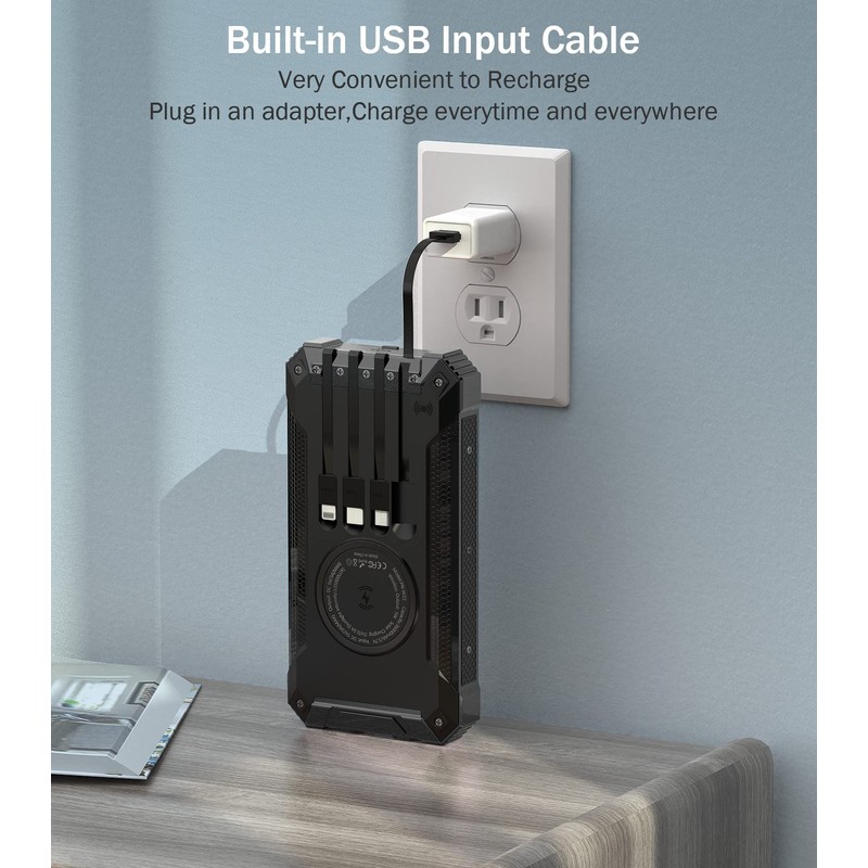 - [Built-in 4 Charging Cables] This power bank is built with 3 output cables ( Type C*1 & iOS*1 & Micro USB*1) and 1 USB-A input cable. No matter output or input, you don't need to carry charging cables. Get rid of messy cables, charge at anytime and everywhere.