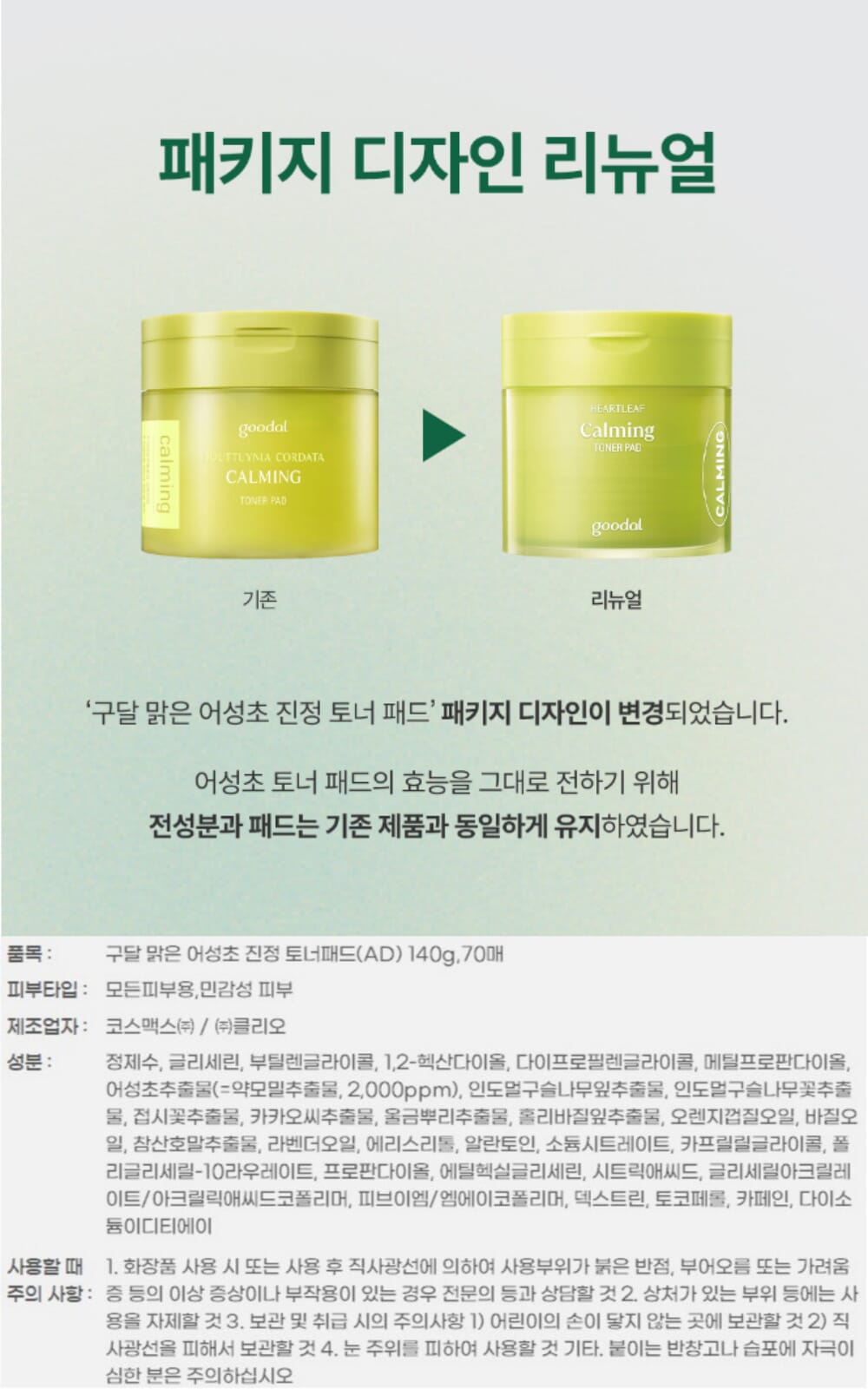 Goodal Clear Houttuynia cordata soothing toner pad 70p, 140g, 1 piece / 구달 맑은 어성초 진정 토너패드 70p, 140g, 1개