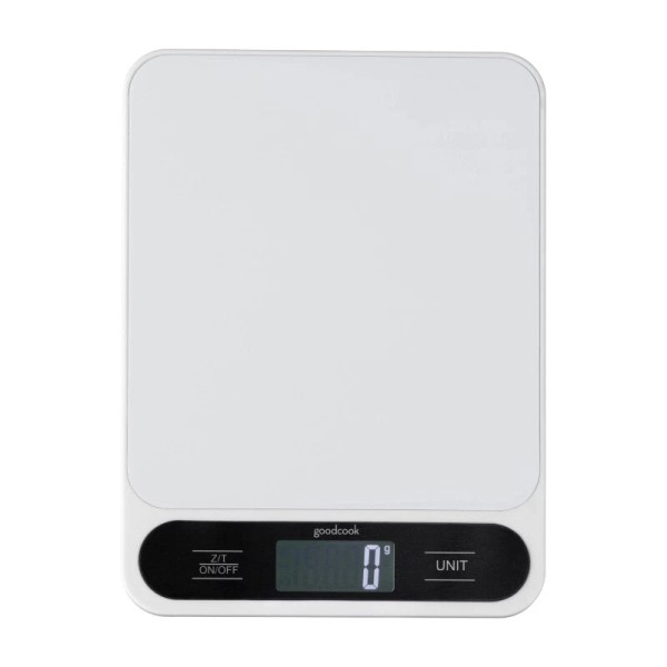 Our GoodCook Everyday Digital Scale accurately weighs and measures up to 11 pounds. The illuminated digital display can clearly show weights in grams, kilograms, pounds, ounces, milliliters and milk milliliters. Tare weight function is available, allowing you to measure ingredient weights without the container. Precise measuring is vital to successful cooking, and especially for baking--don't forget, baking is a science and proper measuring goes a long way to the best results. This scale has auto shut-off and includes batteries.