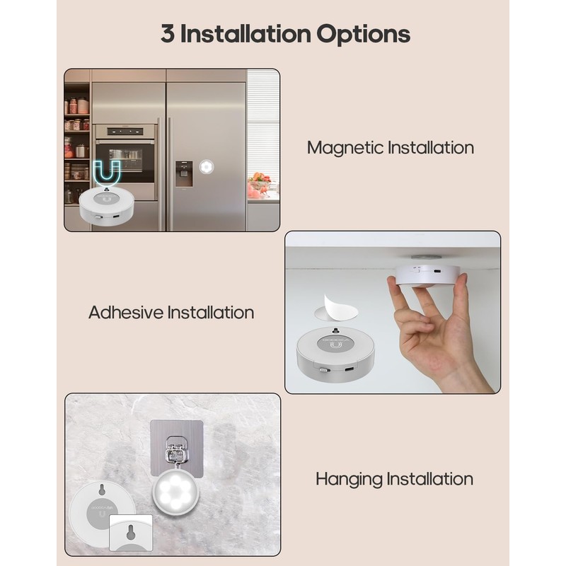 • Flexible Mounting Solutions: With magnetic, adhesive, and hook mounts, these puck lights can be securely attached to any surface, including bedroom walls, under cabinets for kitchen, and door hooks. Ensure your puck lights stay in place without falling off, providing versatile installation options for any space