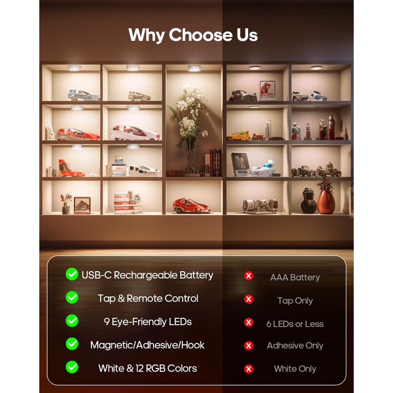 1. Rechargeable puck lights-Enjoy up to 9 hours of continuous lighting on a single charge, and up to 36 hours on low brightness, ensuring reliable and long-lasting illumination.