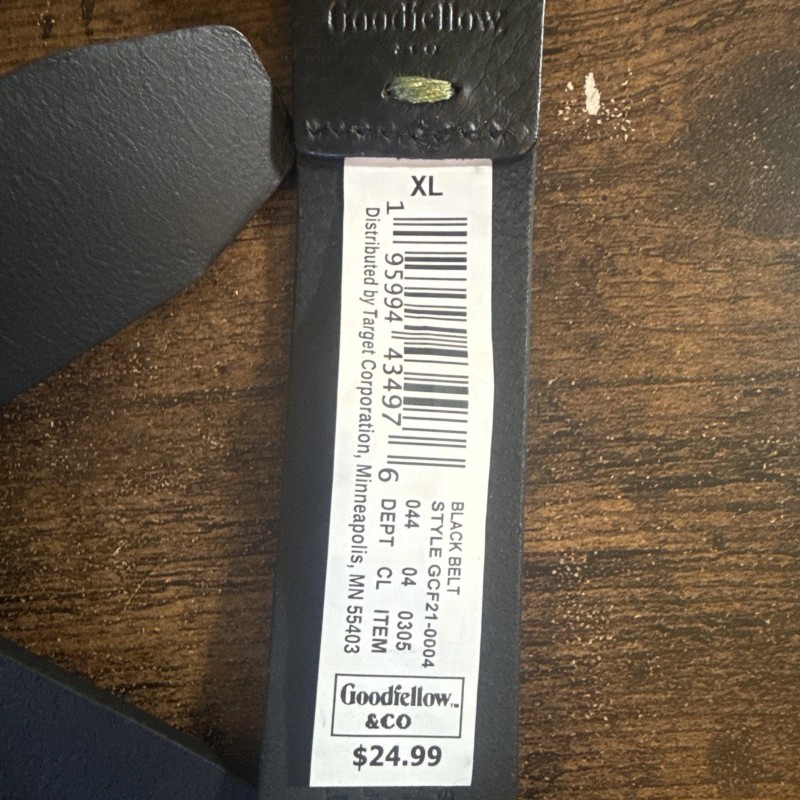 The product is a men's black belt from Goodfellow & Co in size XL (40-44 inches). It features a buckle and is not handmade or vintage. The belt is manufactured in Guatemala. This accessory is designed to provide a stylish and functional addition to any man's wardrobe, suitable for everyday wear or special occasions.