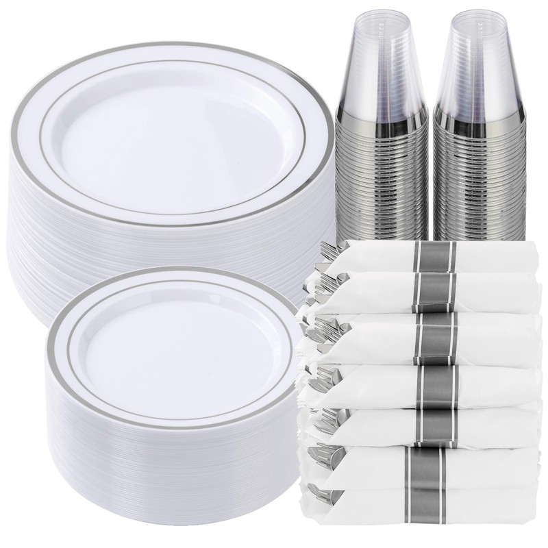- WHAT YOU GET - 350Pcs silver party plates sets for 50 guests with 50 10.25" dinner plates, 50 7.5" salad plates, 50 Paper Napkins, 50 9oz cups, 50 knives, 50 forks, and 50 spoons.
