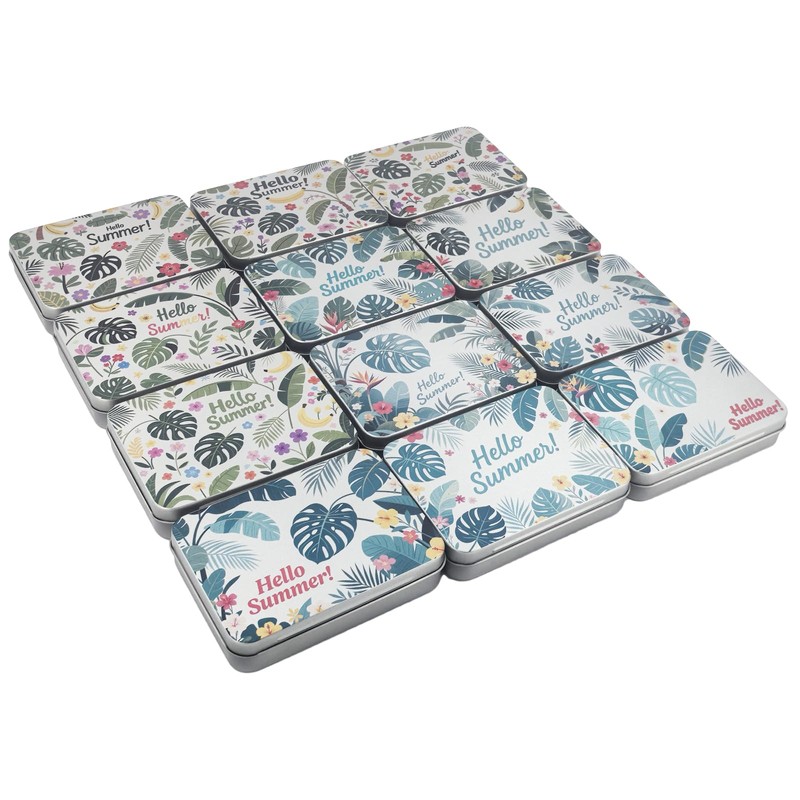 - Contains a total of 12pcs empty rectangular silver metal tins with hinged lids, each tin with custom designed Hello Summer themed tropical plant green palm leaves & flowers image pattern printed on the lid.