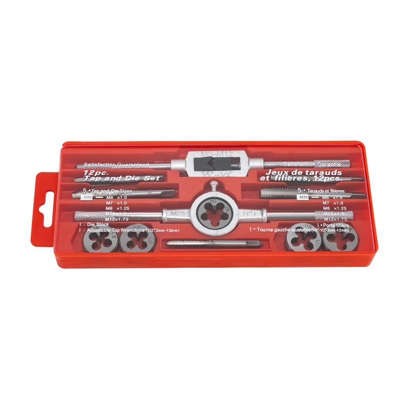 - Set of 12: Die Size: M6 x 1, M7 x 1.0, M8 x 1.25, M10 x 1.5, M12 x 1.75 mm Tap Size: M6 x 1, M7 x 1.0, M8 x 1.25, M10 x 1.5, M12 x 1.75mm 1 x Die-Holder 1 x M3-M12 Tap Wrench