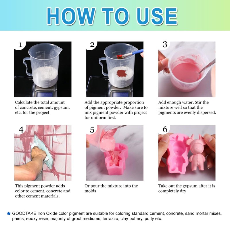 • Easy to Use: Simply mix the desired amount of pigment powder into your project medium for uniform, Just a little goes a long way to bring out a rich color. Note: Make sure to mix iron oxide powder with project for uniform first, and then add water to stir