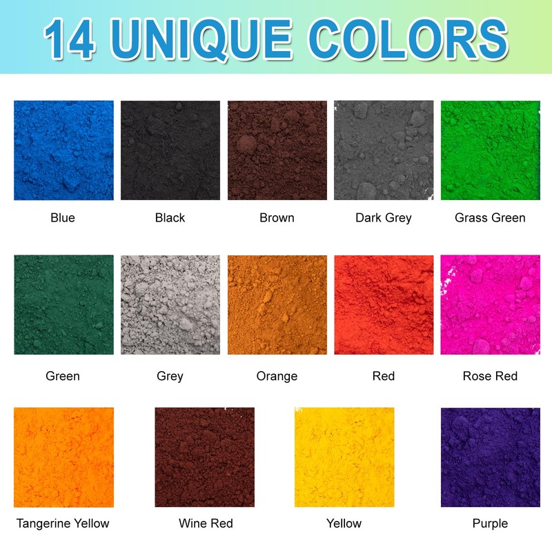 • Pigment Powder Features: Our concrete color pigment are pure natural iron oxide powder with an iron oxide content of 95% and above. and waterproof, non-toxic, sunscreen, easy to color, super hiding power. Each color in an individual reusable bottle