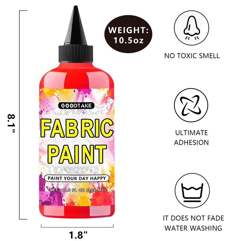 GOODTAKE Red Fabric Paint, 10.5 Fl.Oz (300ml Bottle) Canvas Paint For Clothes, Leather, Paper And Wood, Furniture Upholstery, Shoes or Tote Bags Art Paint's - Lightfast & Vibrant Textile Paints (Red, 10.5 Fl.Oz)