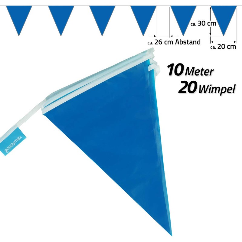 - In the pennant garland 20 pennants of the size 20 cm x 30 cm are sewn in, with a distance of approx. 26 cm. The total length of the garland is 10 metres.