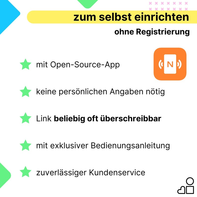 • For self-setup with open source app: This NFC sticker for reviews is programmable without registration or personal details. Can be overwritten as often as you like - buy once, use permanently