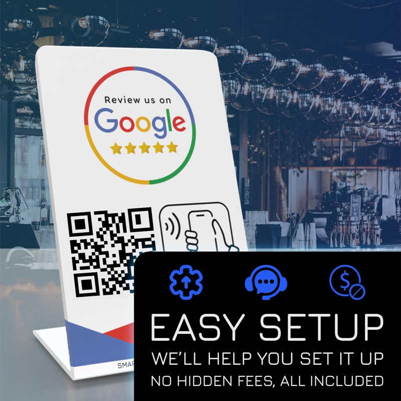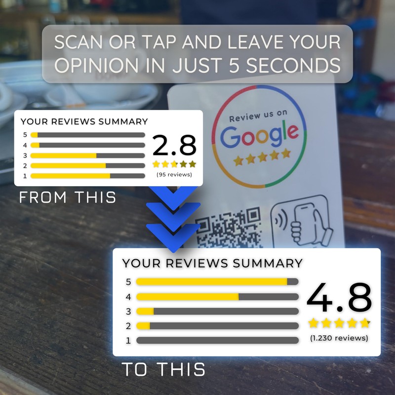 • GET MORE 5 GOOGLE REVIEWS Customers scan or tap on the stand and are redirected directly to your Google Business Review page, customer reviews done in less than 5 seconds.
