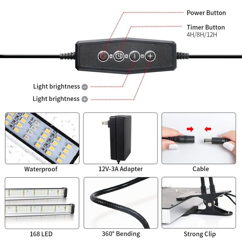 - Easy to Install - with flexible Gooseneck & strong clamp,it allows you to place the growth light in any direction to provide the best lighting angle for your plantsmeet the cover around the plant.Powered by USB or AC Power Plug