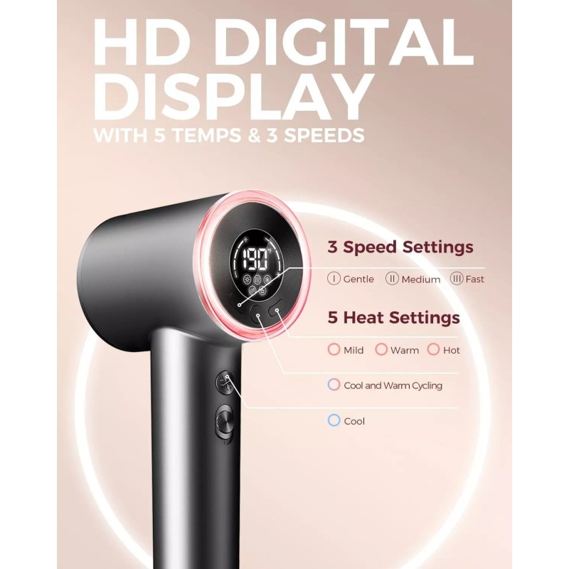 • 【HD Display with 5 Temps & 3 Speeds】The Goolioo hair blower has four heat settings (Cool/Mild/Warm/Hot/Cool and Warm Cycling) and three speed settings (Gentle/Medium/Fast), and you can easily adjust settings to customize the drying experience to your hair type with the Goolioo hairdryer's HD LED display. Alternating hot/cold modes can make your blow drying experience more relaxing