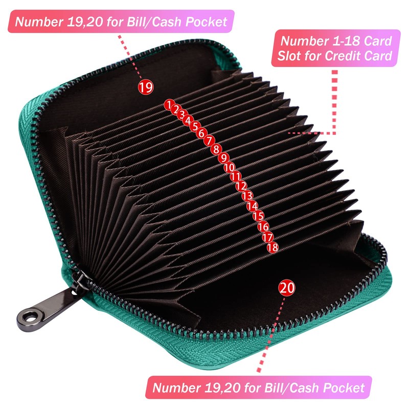 - Large Capacity: 20 Secure Card Slots Fold Accordion Style(18 Credit Card Slots & 2 Cash Slots). The Simple Card Case can hold Credit Cards, Gift Card, ID Card, Driver License, Cash and Coins