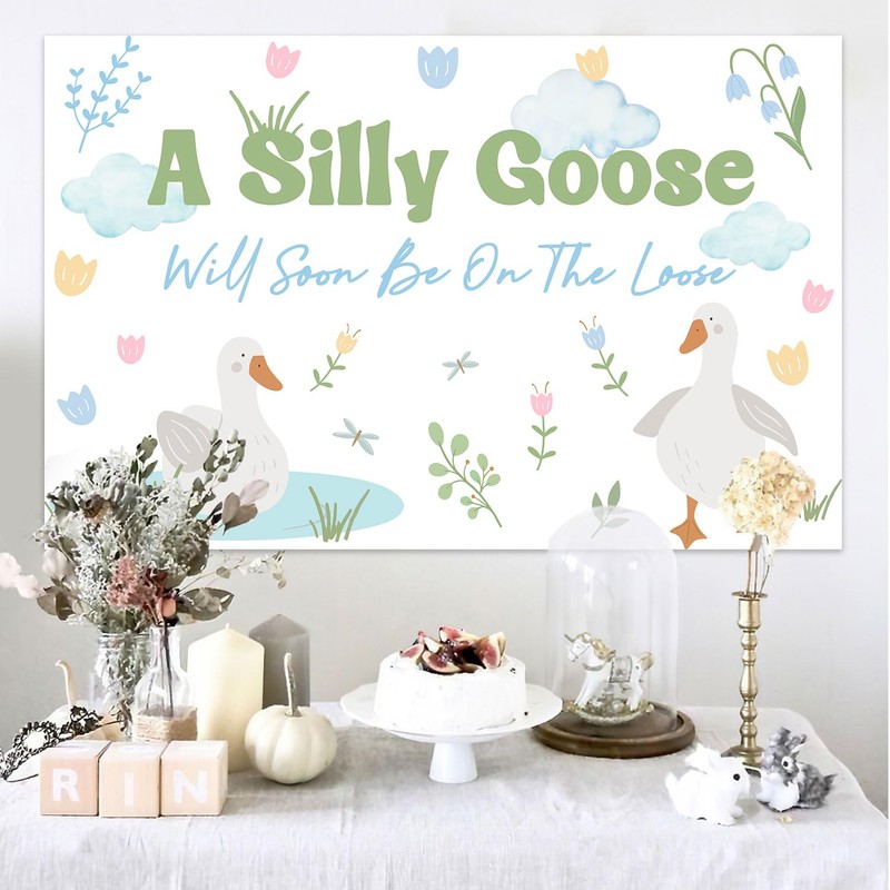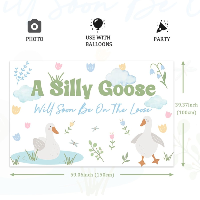 - Playful Text Decoration: The backdrop is printed with the text “A Silly Goose Will Soon Be On The Loose,” using a lively and whimsical font that perfectly matches the theme, adding fun and personalized charm to the party.