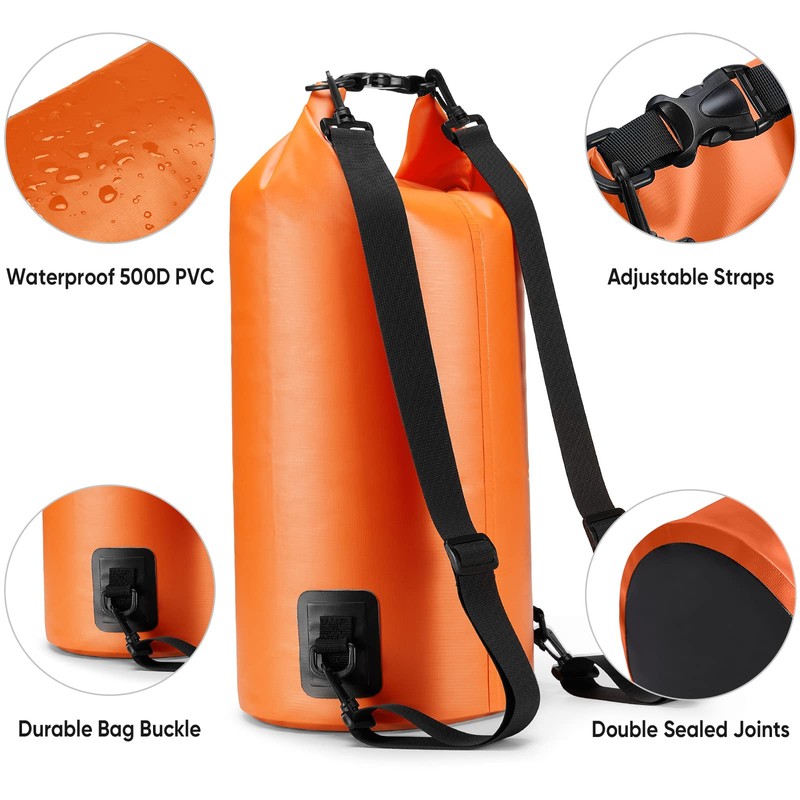 - 🏄♀ Comfortable Shoulder Strap: Our 5L, 10L, and 20L dry bags come equipped with two comfortable straps that accommodate most body sizes. Additionally, there are 2 D-rings at the top for convenient attachment to your waterproof backpack. The smooth surface of the dry bag makes it easy to wipe clean.