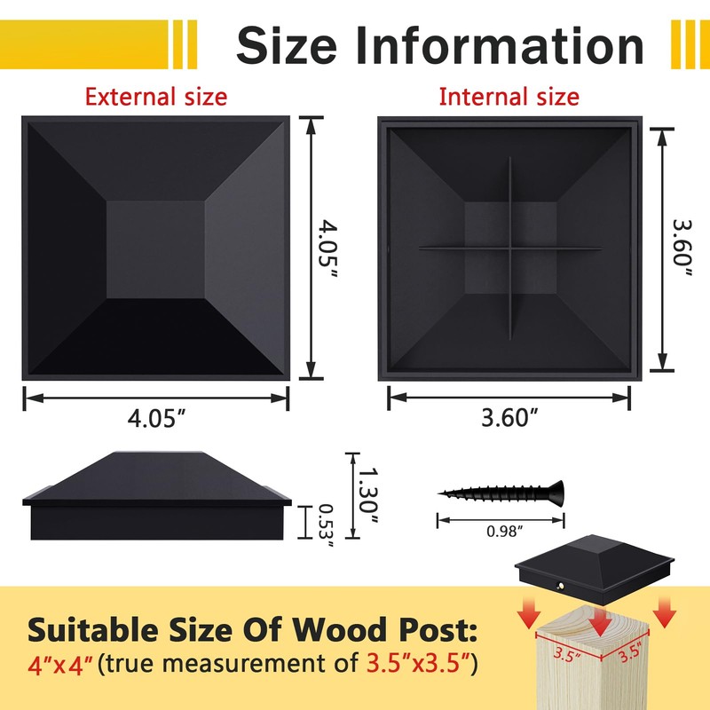 • 【For What Size?】Actual internal size of our fence caps is 3.6”×3.6”, which is suitable for 3.5*3.5 inches to 3.6*3.6 inches wood fence post. Application for protecting the top of wood post like deck railing, wooden fence, woody handrail, porch railing and so on. NOTE that measure your posts before use and sanding is required for the wood to fit the post cover if your wood is slightly larger.