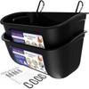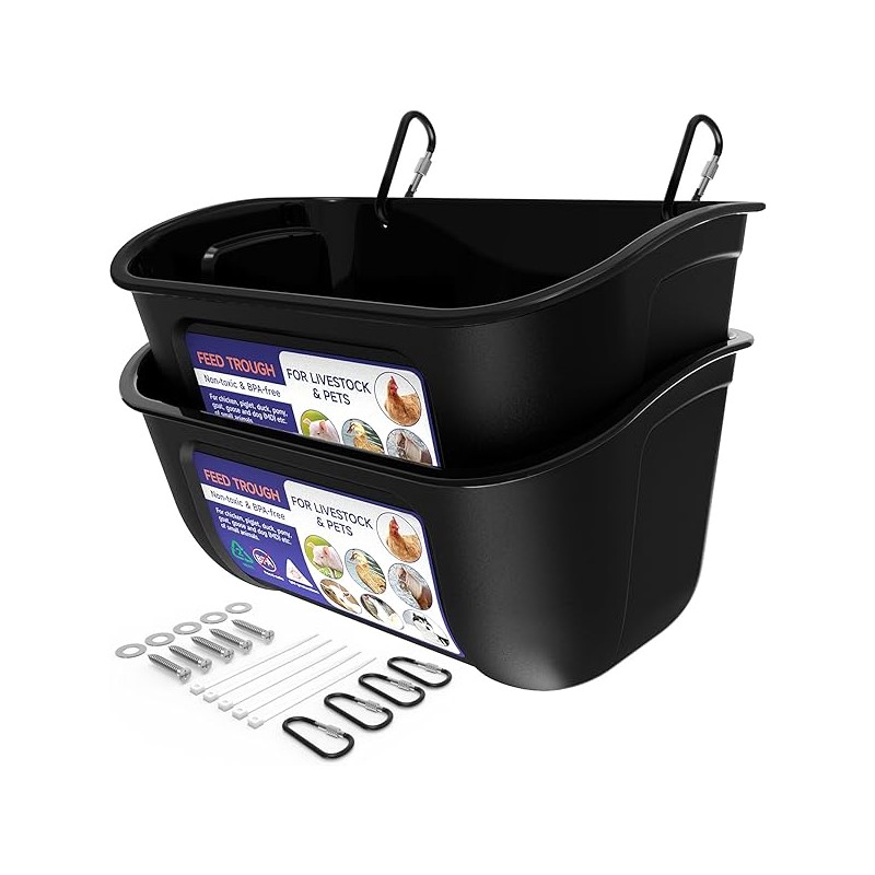 Goovilla Chicken Feeder Waterer, Hanging or Screw-in Fence Feeder with Clips, 2 Pack 5 Quart Goat Feeder Supplies, Duck Piglet Sheeple Coop Dog Livestock Poultry Plastic Feeder Trough Bucket, Black