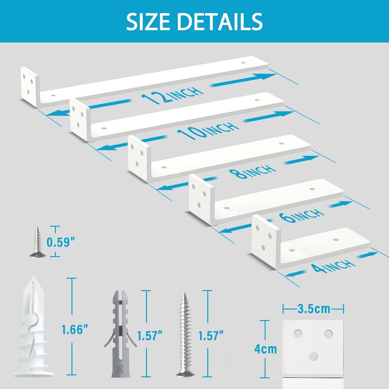 • 【Heavy Duty Iron & Durable Coating】Our floating shelf hardware is made of 1/5” thick, heavy-duty iron, stamped and bent in one piece, no welds are not easy to break with better toughness. Each pair of heavy duty shelf brackets can hold up to 160 pounds of weight. The surface is covered with a thick layer of white frosted coating. It increases the friction between the board and the bracket, on the other hand, it is more waterproof and less prone to rust, which prolongs its service life.