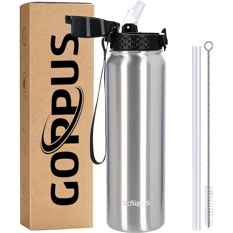 GOPPUS 1L/32oz Thermosflasche mit Strohhalm Doppelschicht Edelstahl Trinkflasche 1 Liter Isolierflasche Auslaufsicher Sport Wasserflasche Kohlensäure Water Bottle Trinkflaschen BPA-frei Wasser Flasche