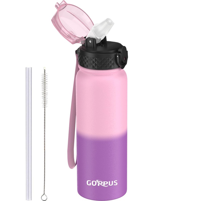 GOPPUS 600ml/20oz Stainless Water Bottle with Straw Double Wall Insulated Bottles with Strap Reusable Vacuum Thermal Flask Leakproof Keep Cold Drinks Bottles with Flip Top Lid for Men Women BPA Free