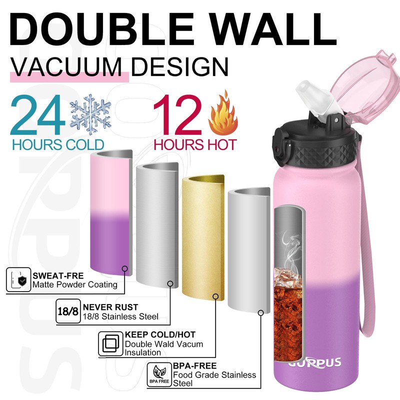 - 【Vacuum Insulated Water Bottle】 Double wall insulation makes it sweat-free! Maintains temperature and keeps drinks cold for up to 24 hours and hot for up to 12 hours.