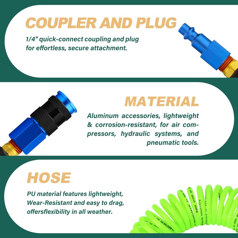 - Widely Use: Used for pneumatic tools, connect this air hose to air compressor, it is suitable for, air spray gun, air nailer, air blow gun and tire inflator gauge, the green hose is highly visible, making it easy to quickly locate the hose on a busy job site.